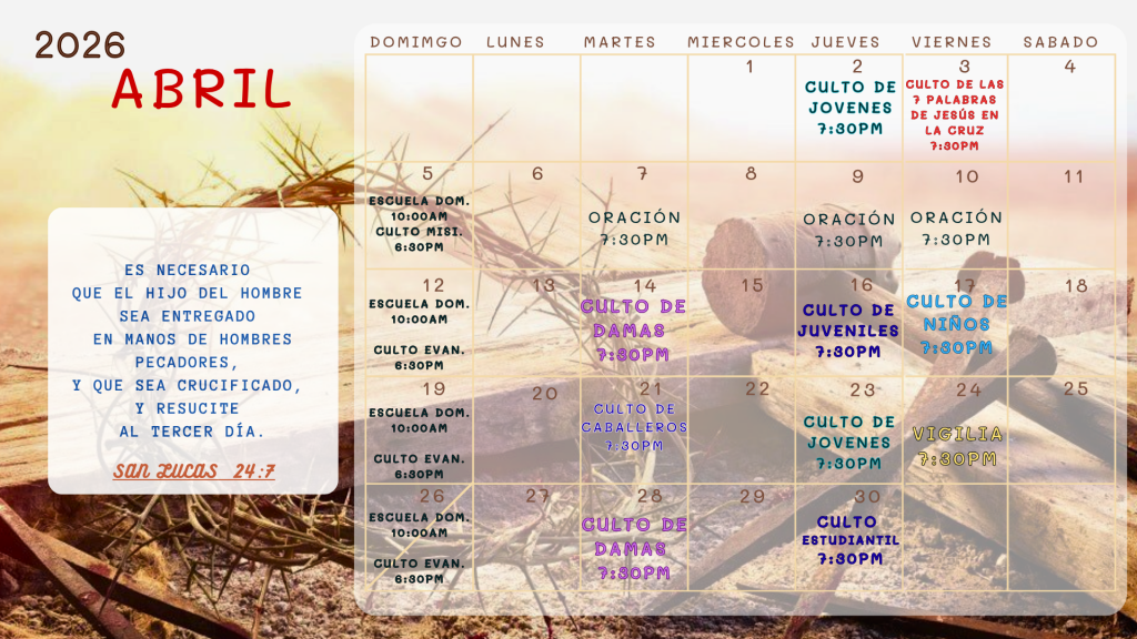 Con alegría les compartimos el calendario de este mes de abril. Es un tiempo lleno de nuevas oportunidades para buscar más de Dios, servir y crecer juntos como iglesia. Les invitamos a ser parte de cada servicio y a continuar edificándonos en unidad y amor.